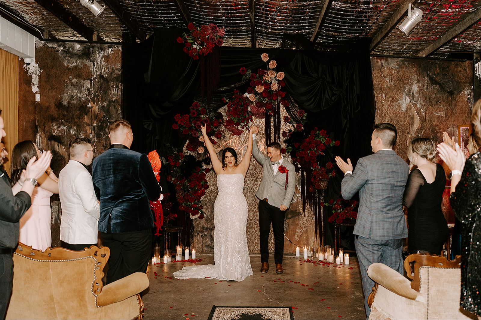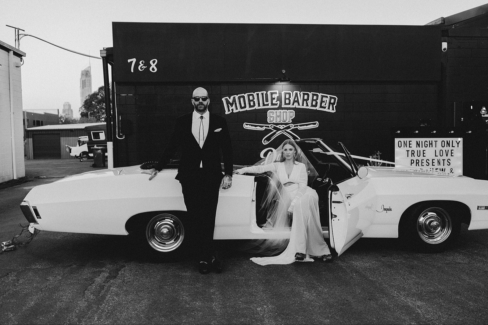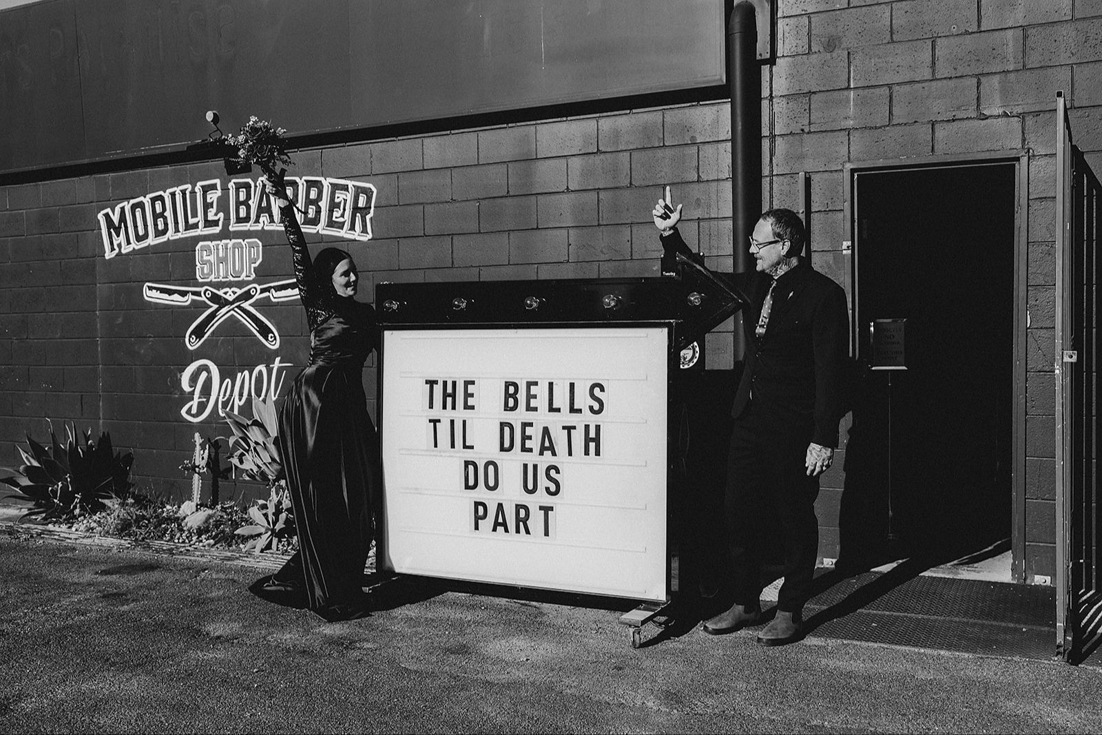 Get Ready to ignite your elopement at The Mobile Barber Depot, where the venue's insane vibes and styled arbour crank up the cool factor to legendary levels